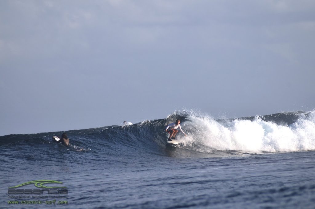 Depois das primeiras remadas, das primeiras abordagens aos inúmeros peixes que se cruzavam e faziam dispersar a atenção…surgiam as primeiras tentativas de surfar aquelas ondas… uns conseguiram uma ou outra onda…outros não… o nível de evolução ajudava a definir quais as ondas que cada um conseguia apanhar. Não era, propriamente, um spot exactamente igual àquele onde costumavam surfar e a que todos estavam habituados. Para além disso a existência dos recifes ajuda a criar condições específicas na definição de cada onda. O elemento “desconhecido” era um dos factores intervenientes na decisão de cada um em apanhar esta ou aquela onda… surfar e um pouco antes de terminar, literalmente, em cima dos corais, virar e concluir aquela onda por ali mesmo! Muitos foram os que, no final de cada dia, e mais no final da viagem em que a confiança já se encontrava algo reforçada, faziam o balanço dos arranhões provocados pelos corais ou dos picos deixados pelo pisar dos ouriços que viam o seu habitat um pouco invadido…"